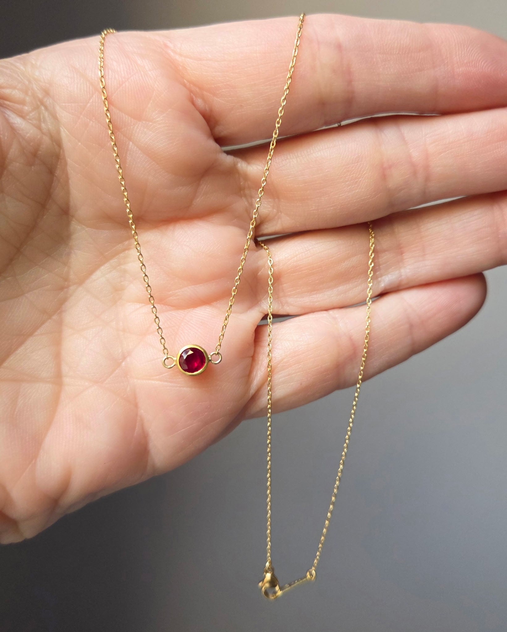 A new mom wanted to celebrate her son's arrival in July with a delicate ruby birthstone necklace. Our client chose from a few special rubies in Aviva's collection, and the finished piece is made with 22/18k gold.