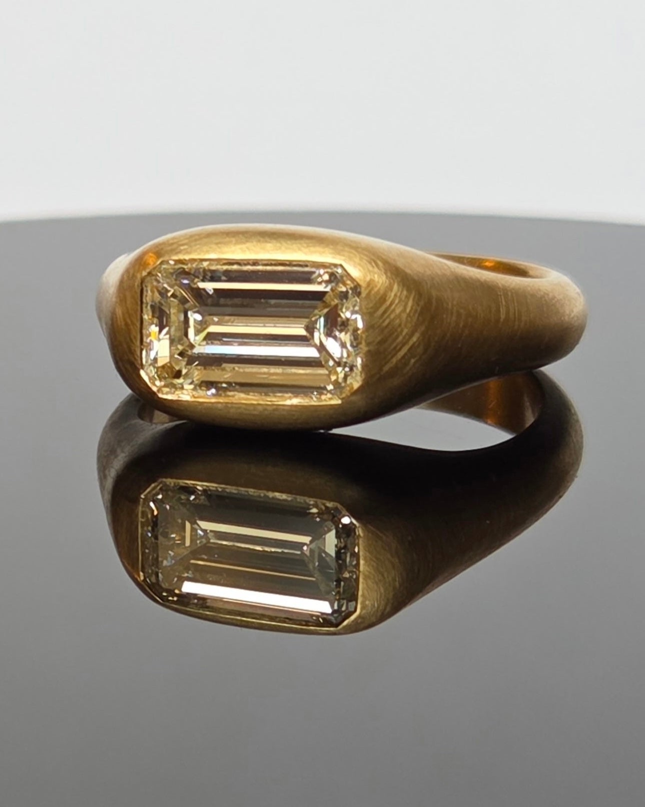 We collaborated with a dear client in Los Angeles to bring this sculptural engagement ring to life. After sourcing a 1.2 carat emerald cut diamond, the piece was handcrafted in 18k gold.